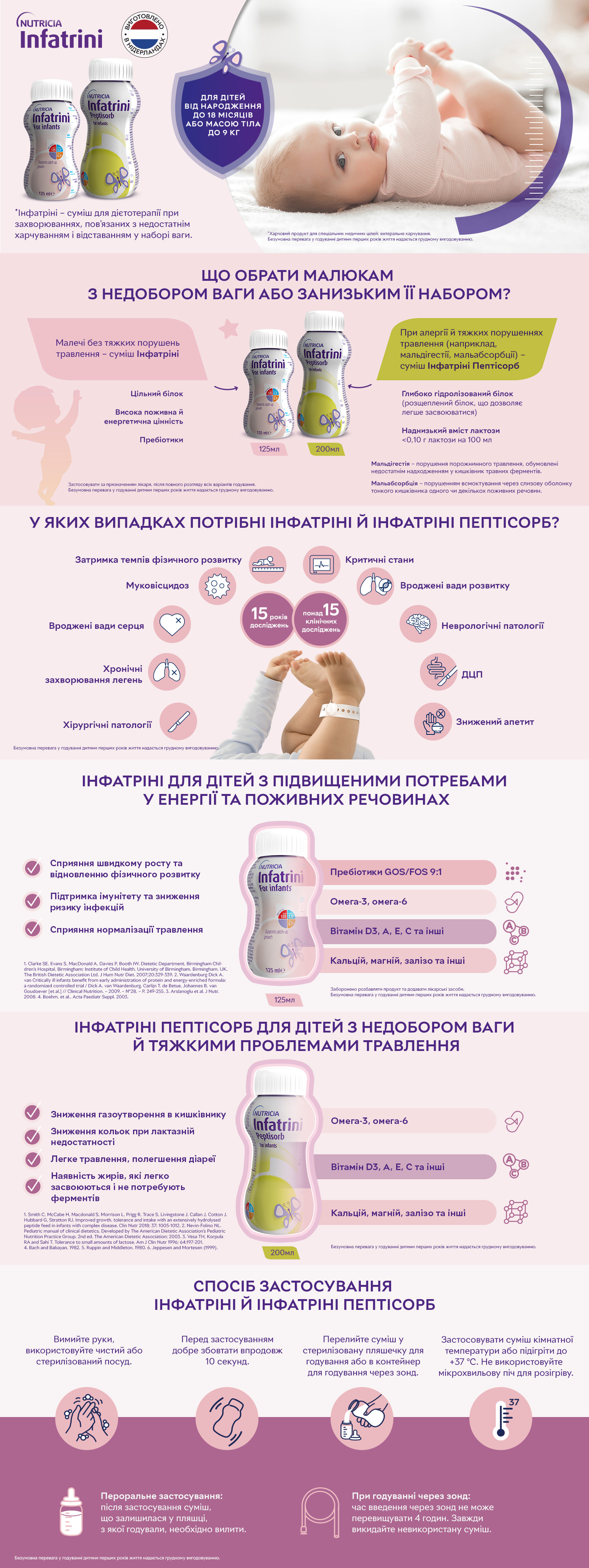 Для дітей від народження до 18 місяців або з масою тіла до 9 kg (кг) з затримкою фізичного розвитку, підвищеними енергетичними потребами та/або з обмеженнями споживання рідини, з харчовою непереносимістю та з харчовою алергією.