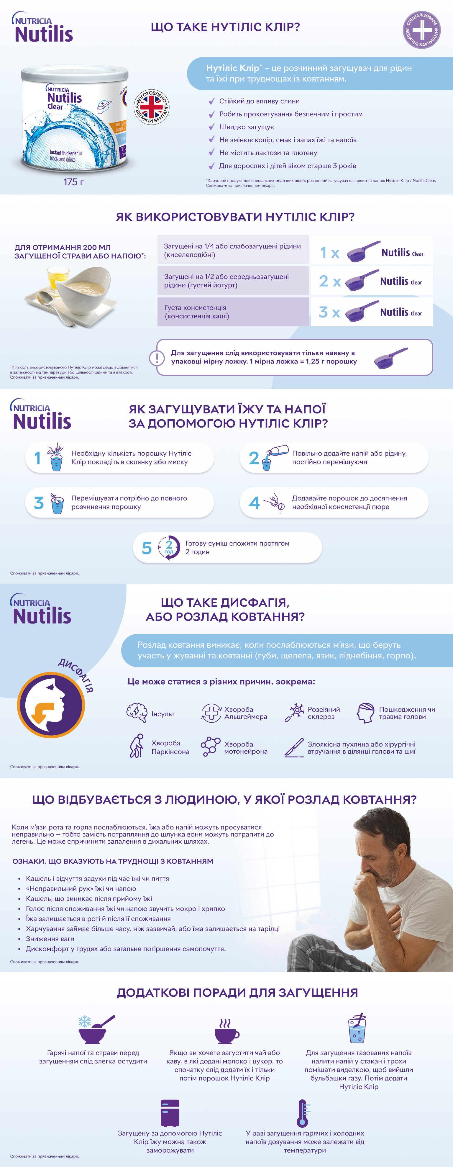 Додаткова інформація: Для забезпечення більш безпечного ковтання Нутіліс Клір / Nutilis Clear містить компоненти, стійкі до амілази ротової порожнини. В результаті напої, загущені Нутіліс Клір / Nutilis Clear, краще зберігають свою консистенцію в ротовій порожнині.