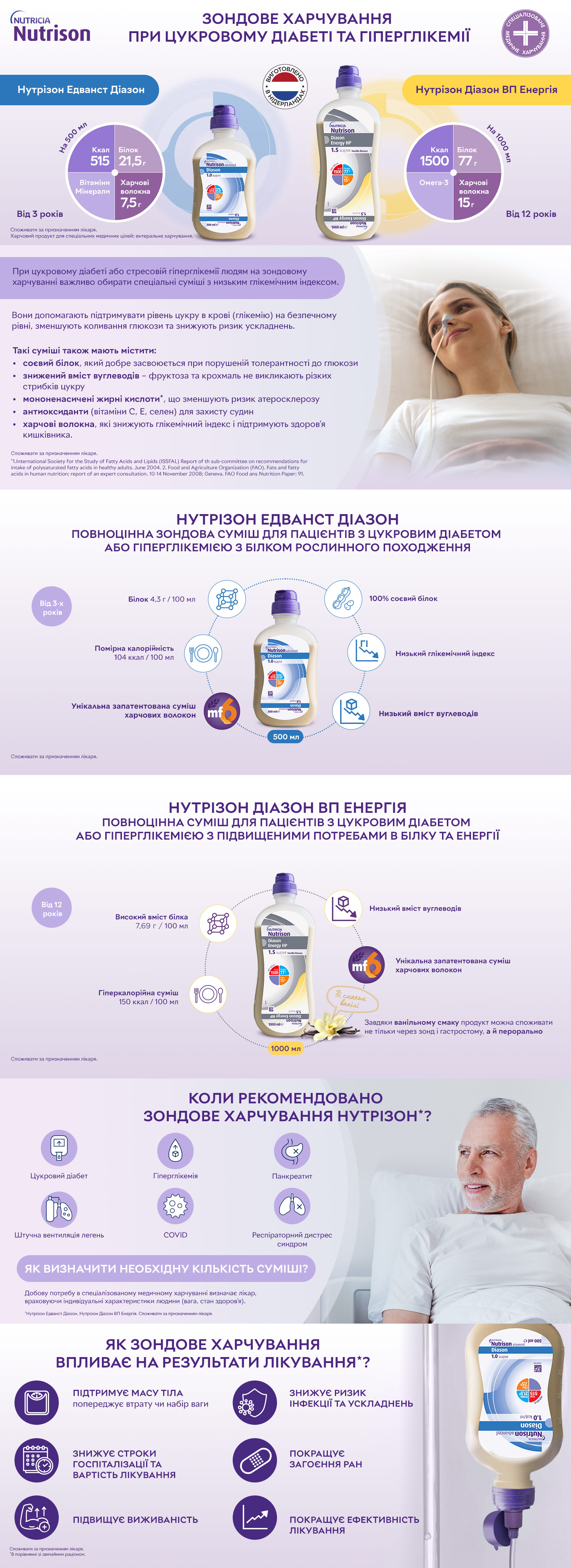 Харчовий продукт для спеціальних медичних цілей: ентеральне харчування Нутрізон Діазон ВП Енергія / Nutrison Diason Energy HP – суміш рідка, повноцінна, збалансована, з високим вмістом енергії та білка, з харчовими волокнами, готова до вживання для годування через зонд. Для дієтичного харчування при мальнутриції (нутритивній недостатності) для пацієнтів з цукровим діабетом або гіперглікемією з підвищеними потребами в білку та енергії від 12 років і старше та дорослих.